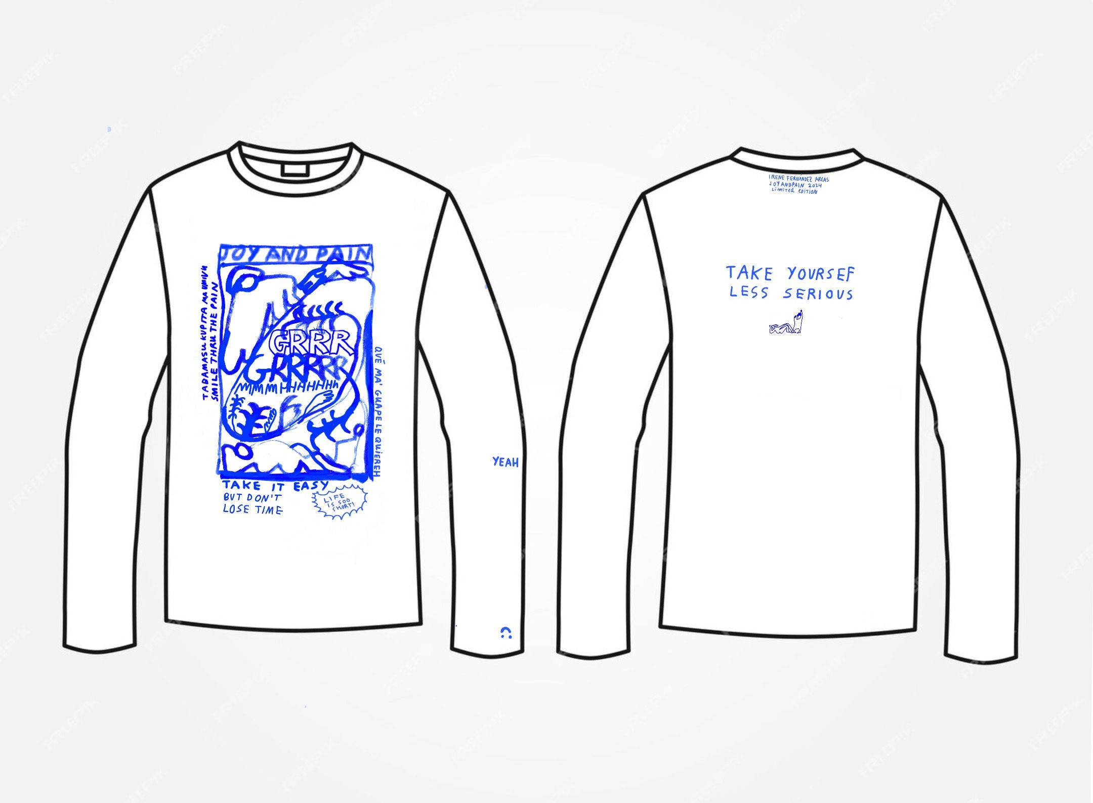 For it, irene launched a merch line titled “Joy&Pain,” designed specifically for this fundraiser. The collection explores life’s connection between trauma, resilience, joy,& pain. Inspired by the transformative power of music, the design emphasizes connection, healing, and hope. The concept, “tabasamu kupitia maumivu” (Swahili for “smile through the pain”), reflects the resilience and hope we aim to nurture. The item is a limited-edition shirt printed in blue by blackandink.