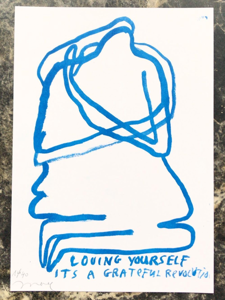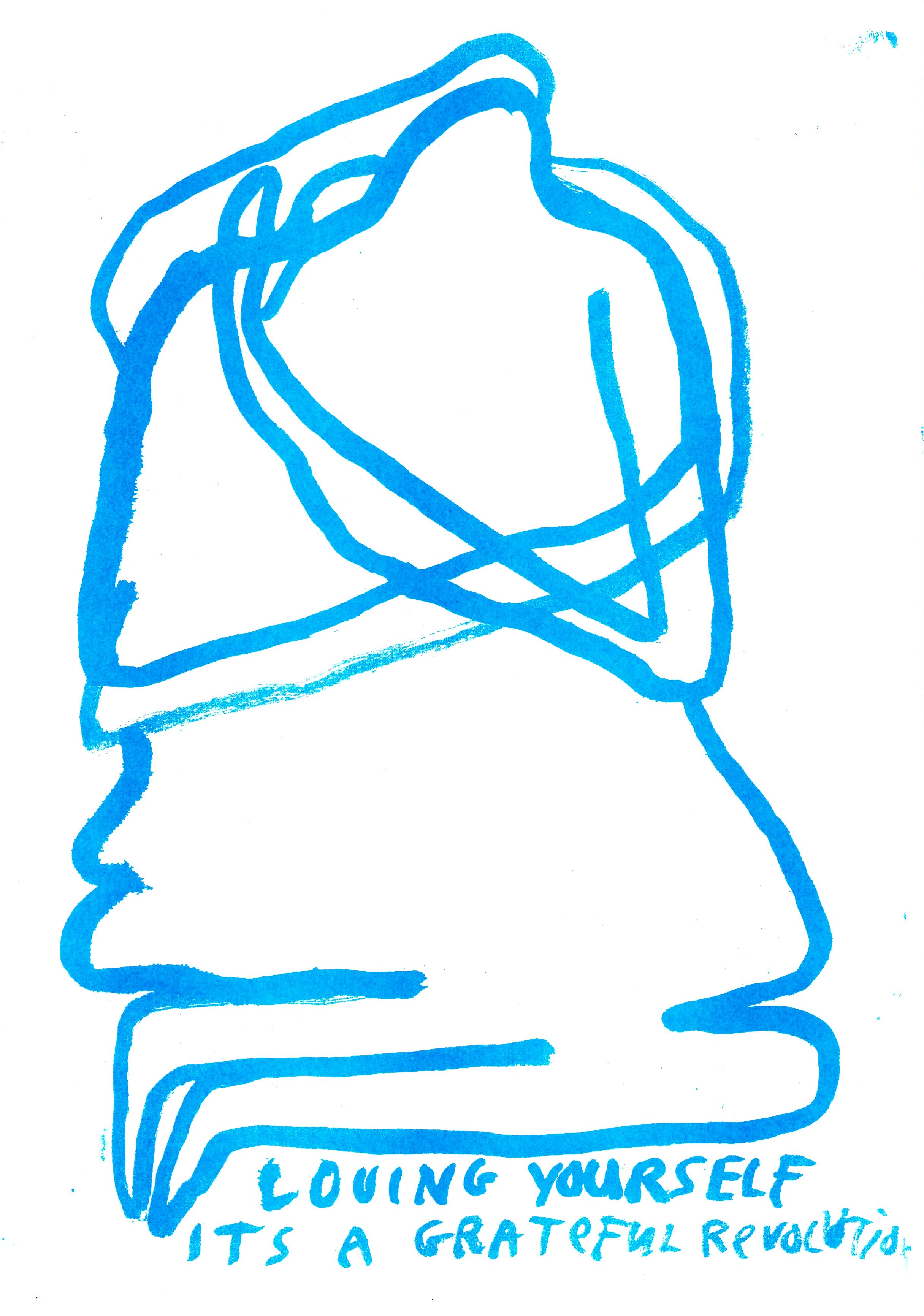 Loving yourself is a great revolution., 2020. Riso print in Munken a4 polar paper 220g, edition of 40 shipping costs extra. This print was made as a limited edition serie that I especially created with much joy for Original Feelings Yoga Studio, ass ca collaboration with their quotes and my drawings 🌚 q printed in Modem Studio